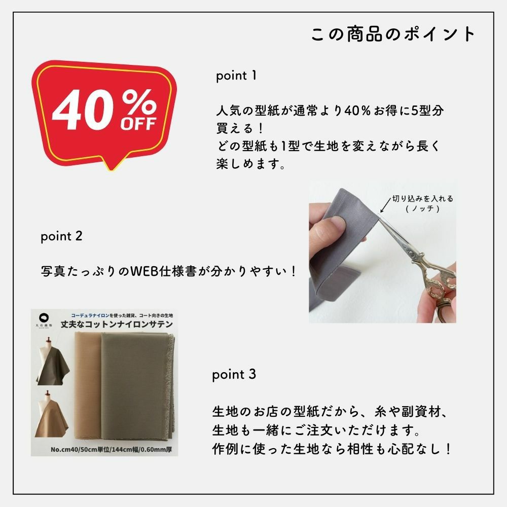他の画像を見る なが~く、楽しめる5型分! No.pattern-assort-zakka なが~く、楽しめる5型分! オリジナル雑貨型紙お得な詰め合わせ ¥ 1,980 税込 (0) お気に入りに登録する