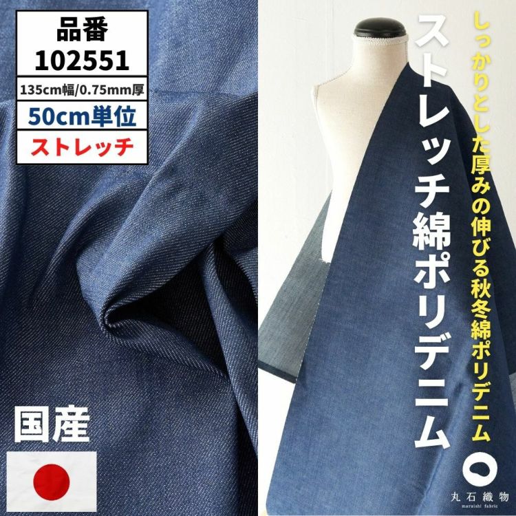 生地 布 無地 ストレッチ綿ポリデニム 50cm単位 135cm幅 0.75mm厚【商用可能】